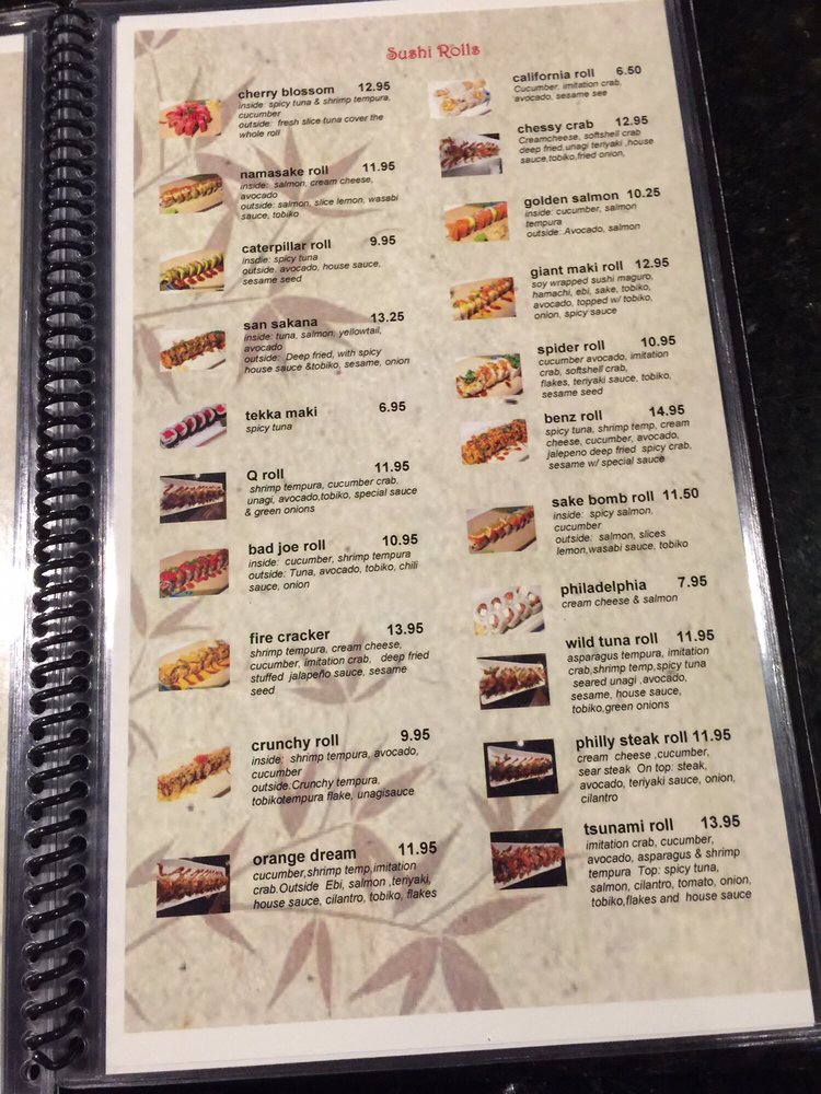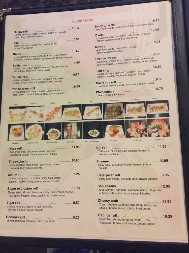 Inside: Spider, cucumber, cream cheese. Top with salmon, eel, tobiko, scallions, and house sauce.